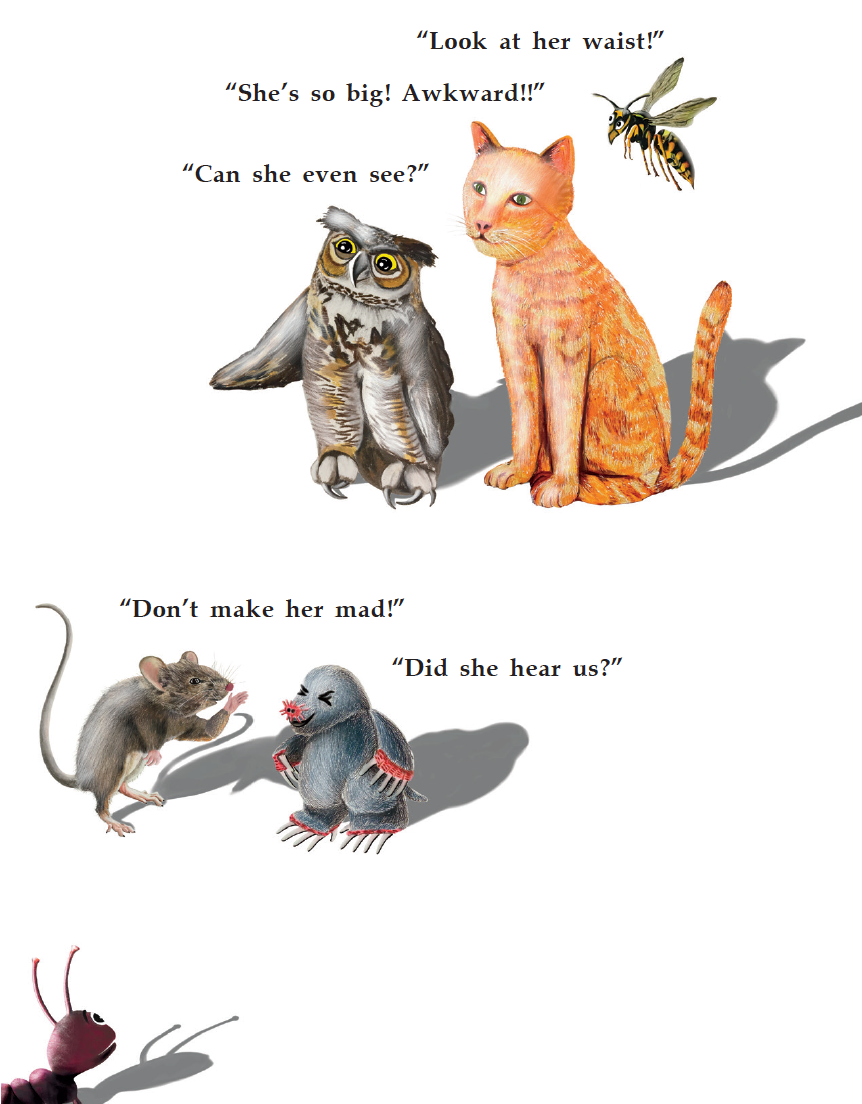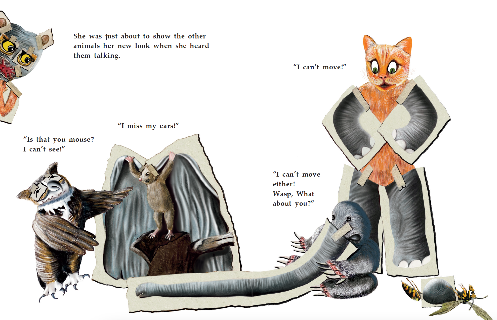 She takes Owl’s beautiful eyes, Wasp’s tiny waist, Mole’s star-shaped nose, Mouse’s dainty ears, and Cat’s long graceful limbs and TA DA! She thinks she’s gorgeous.