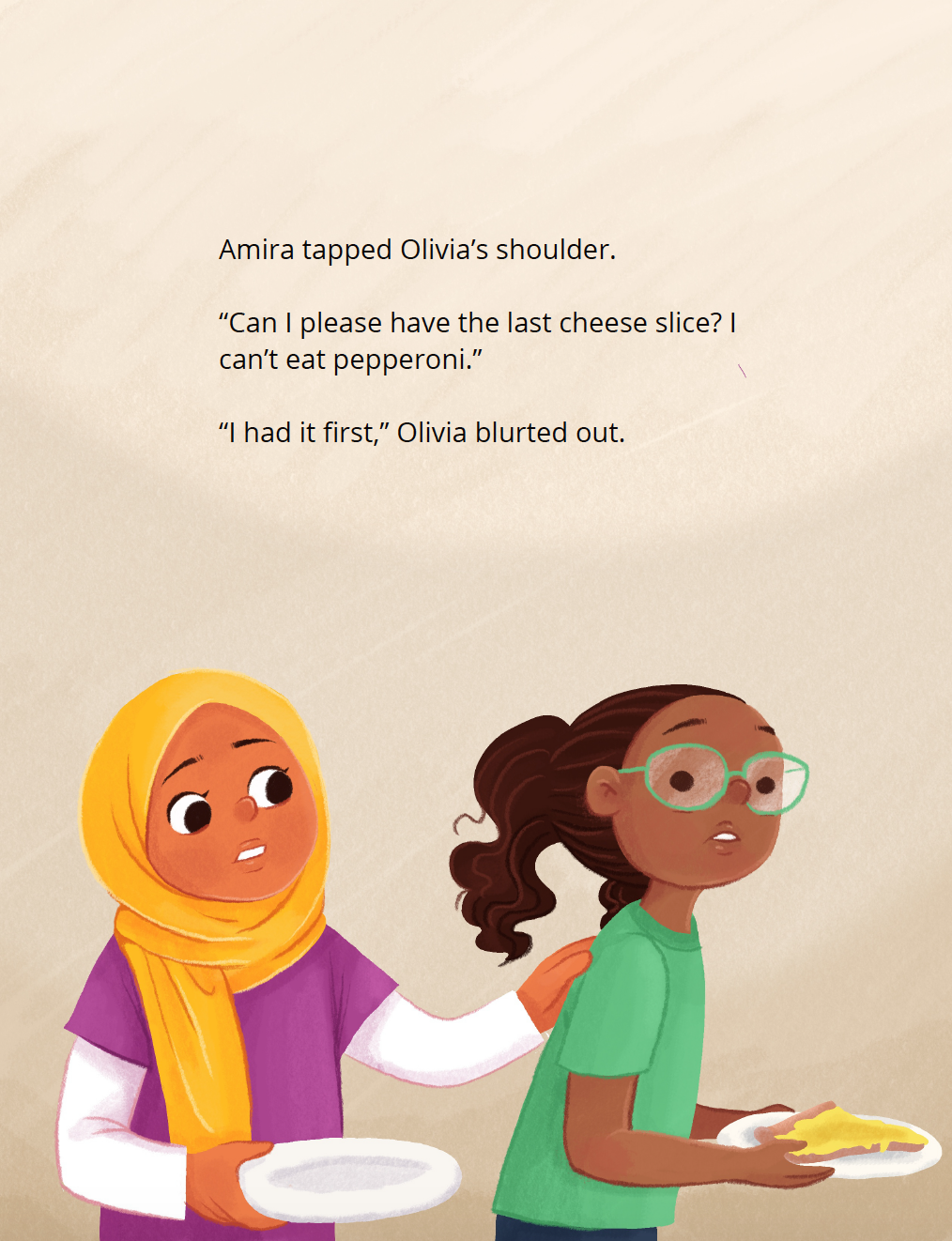 Amira used to love eating cheese pizza and playing baseball with her friends. But at her new school, she sits all alone and can't even have her cheese pizza slice because of Olivia!