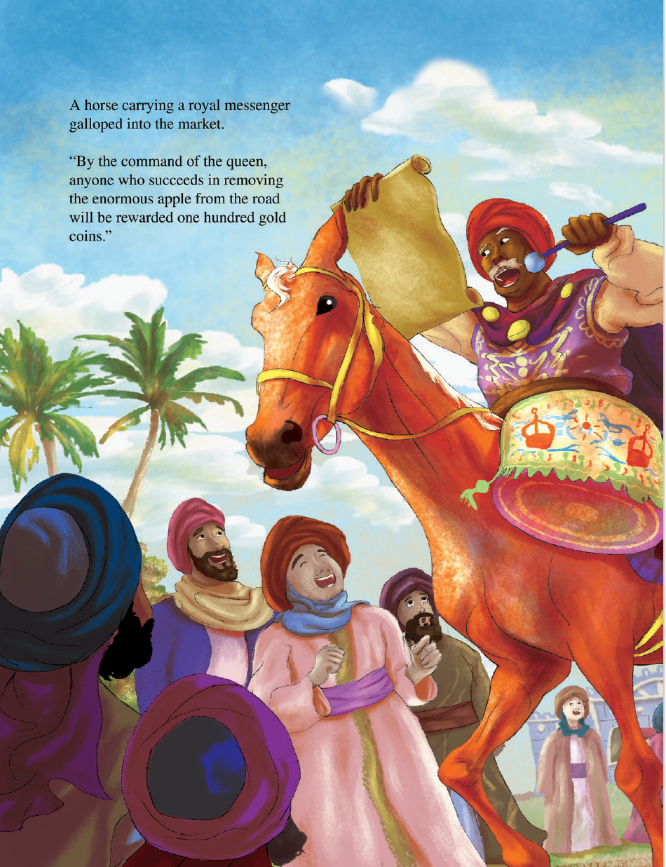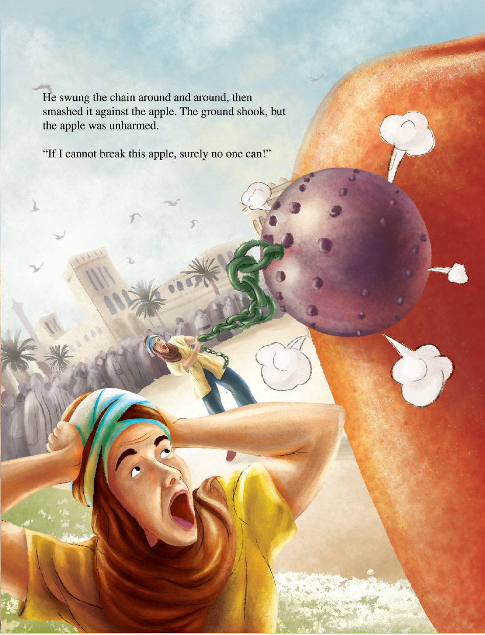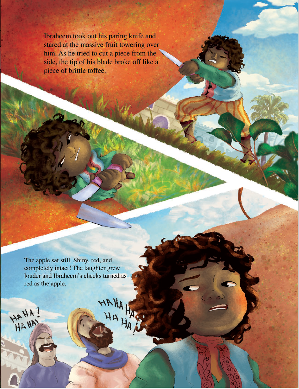 Ibraheem is a young boy who longs for adventure. But life on the family farm is boring. After hearing of an extraordinarily large apple blocking an important road in the kingdom, Ibraheem travels to the city with his grandfather to see it. Hopefully have the adventure he has always longed for!