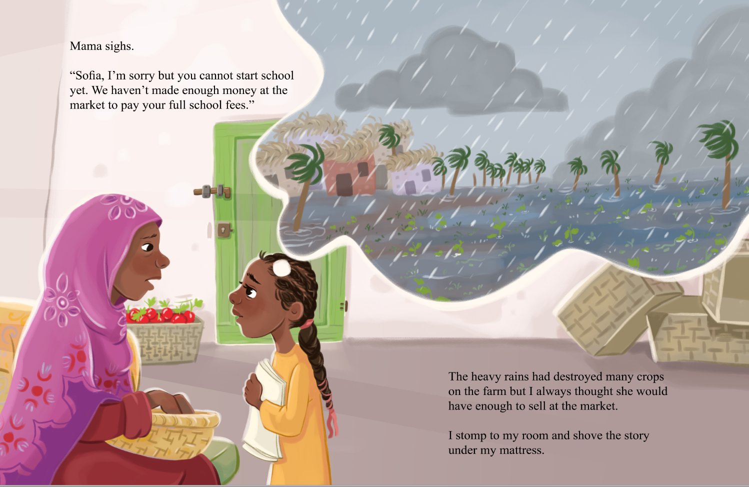 Sofia loves school, but when their crops are ruined, her mom is unable to pay the fees. Sophia helps her mother in the field, but is really sad. So she devises a plan to get the fees herself. She makes tamarind juice, feeds a donkey to help his owner win the race, and collects every penny. But when it all doesn’t add up, she has to find the strength to write from her heart even when it isn’t in school.