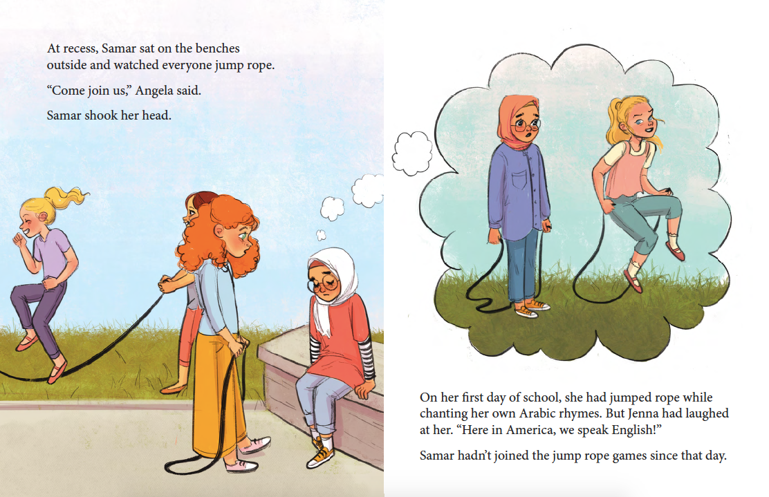 Samar has recently moved to America from Syria, and everything is new. Even the jump rope games at recess are unfamiliar. It doesn't help that Jenna, the class bully, keeps making fun of Samar's accent.